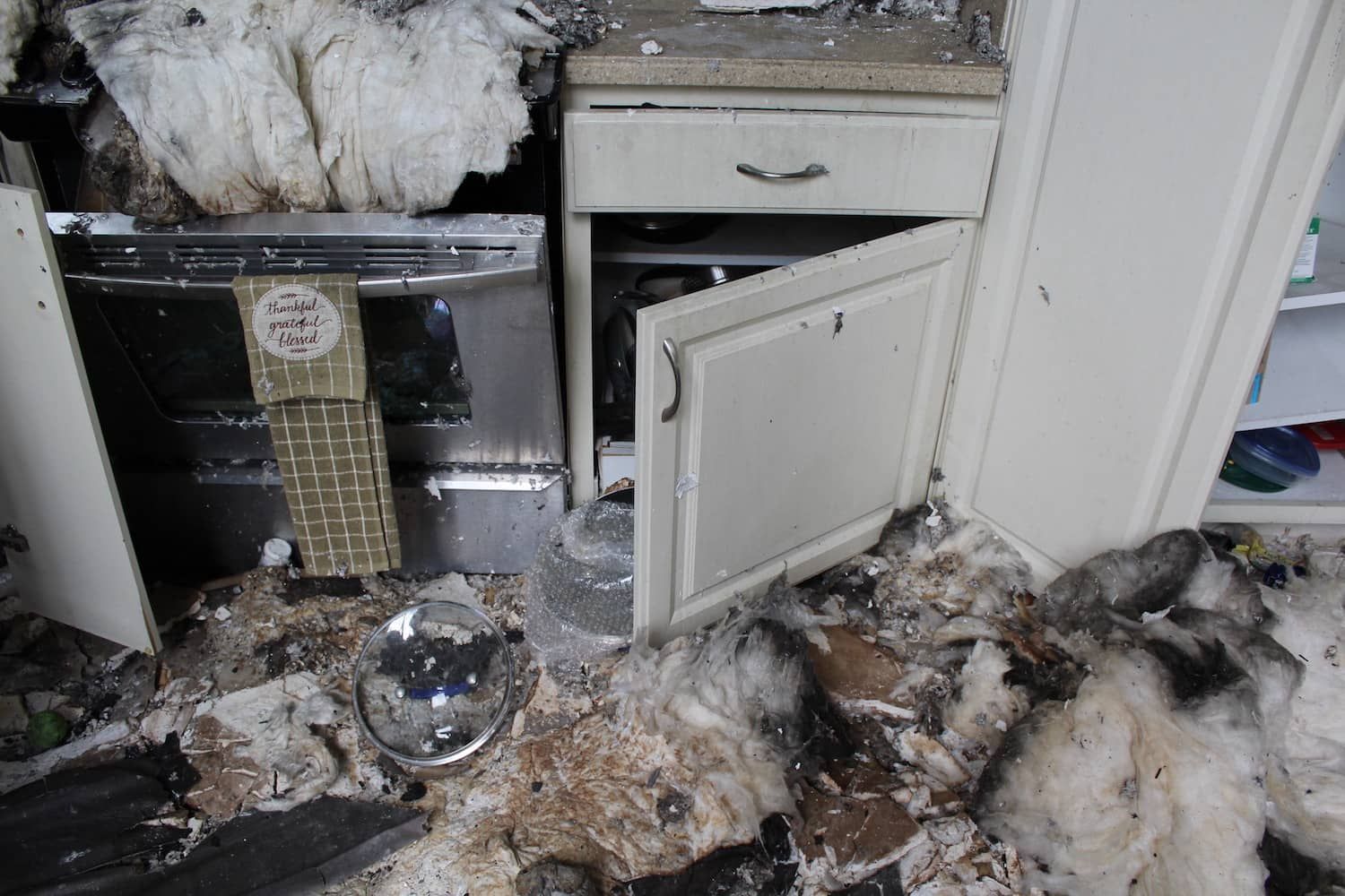 Based on their walkthrough, they were able to determine that the fire affected the kitchen and most of the other parts of the home as well. There was serious fire and structural damage to the ceilings, which had collapsed. There was also a lot of soot throughout the home that would need to be removed.